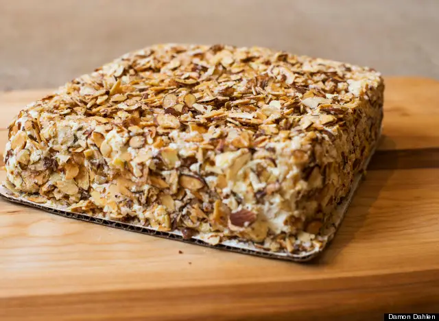 In 1970, the torte was conceived by Henry Prantl after attending a national bakers conference, when 13 bakers demonstrated one good item from each of their bakeries. At the demonstration, Prantl took detailed notes when an Anaheim baker demonstrated the Burnt Almond Cake. When he got back to Pittsburgh, he altered the recipe. He changed the sponge cake to a sweet yellow cake and added custard between the layers. He topped the cake with Prantl’s famous buttercream and toasted almonds. (There was an almond surplus the same year and the Almond board was persuading bakers to use almonds in new and inspiring ways). Prantl kept the name of the cake and its square shape as it appears today.