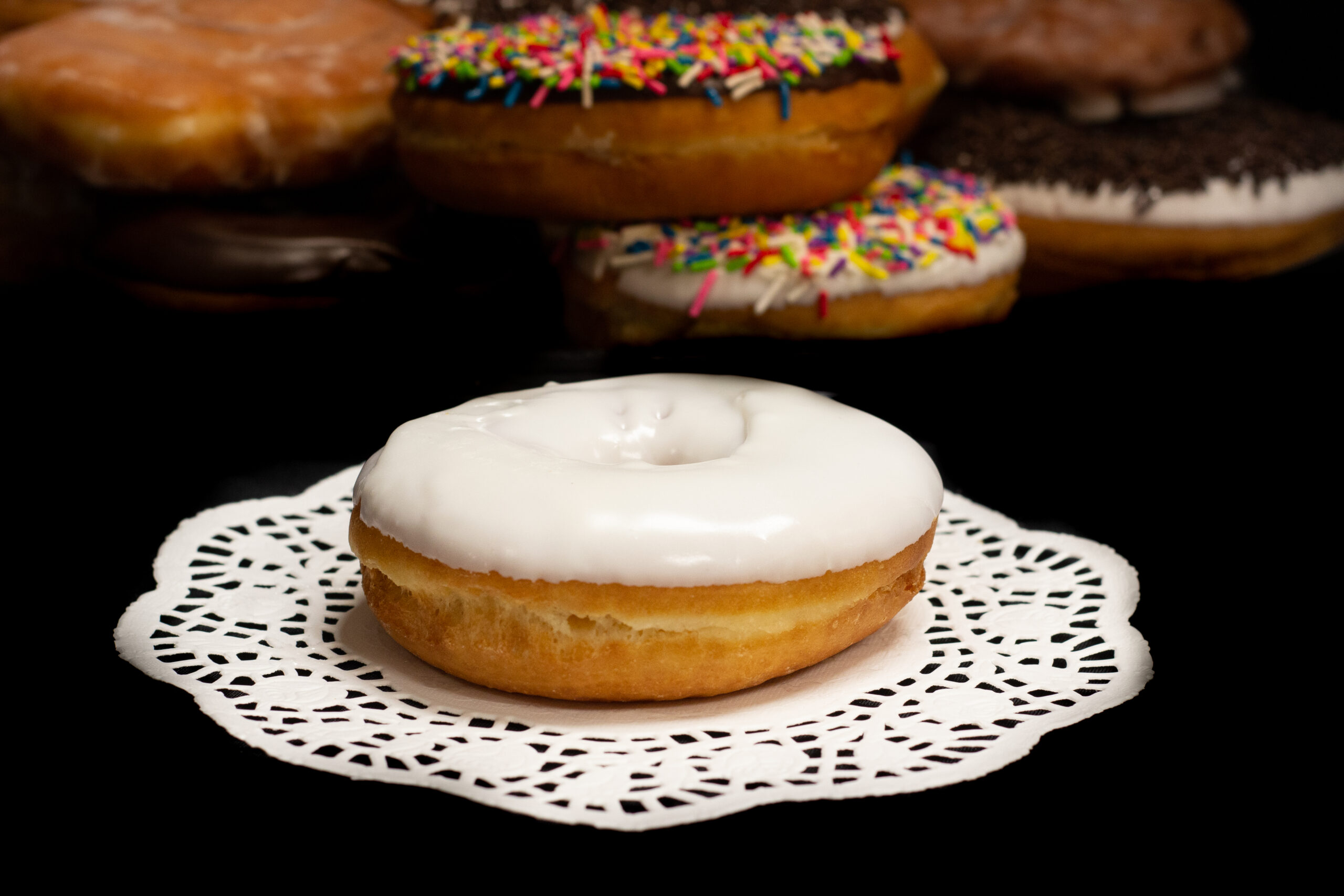 A round yeast donut topped with white icing.