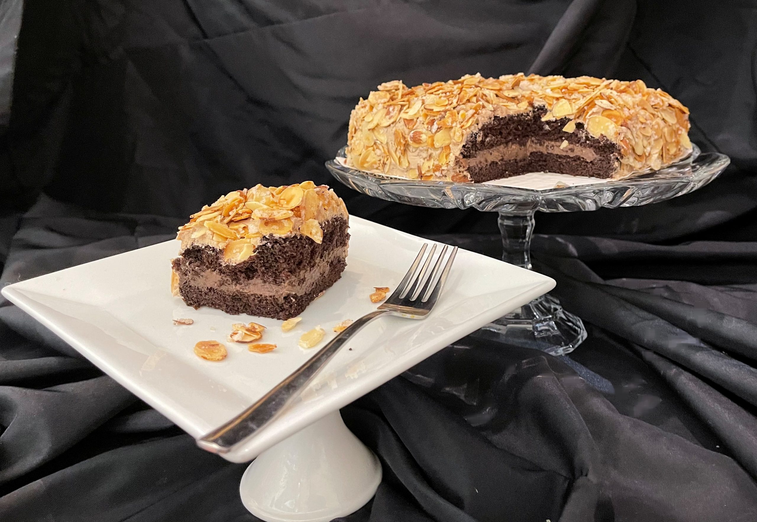 8″x8″ torte serves 8-10 people 1/4 sheet serves 16-20 people 1/2 sheet serves 30-36 Full sheet serves 60-72 This twist on our famous Burnt Almond Torte is made with chocolate cake, chocolate custard, and chocolate icing covered in our secret recipe toasted almonds. Requires refrigeration.