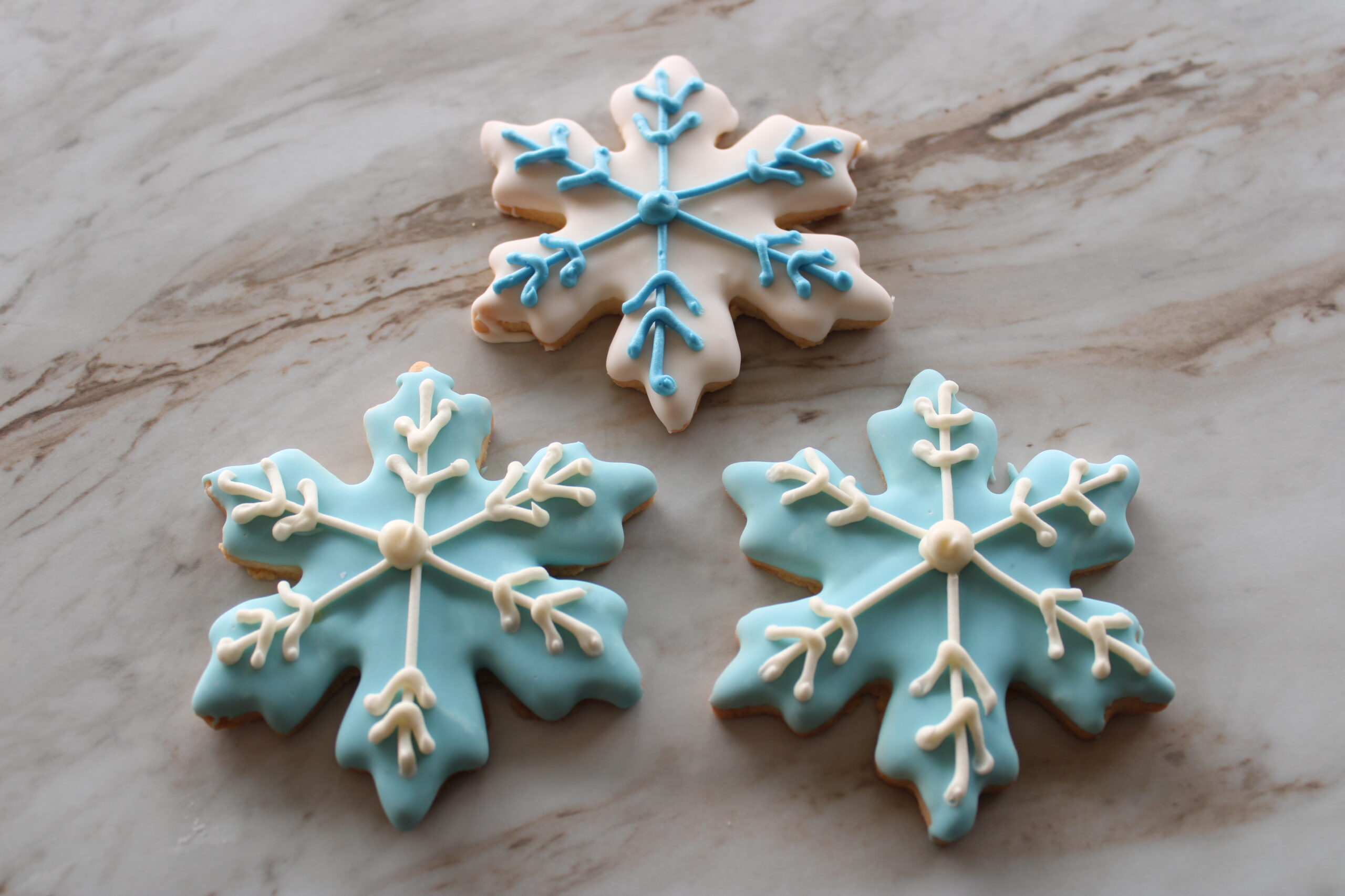 Snowflake cookies decorated with blue and white icing make a cool holiday display.