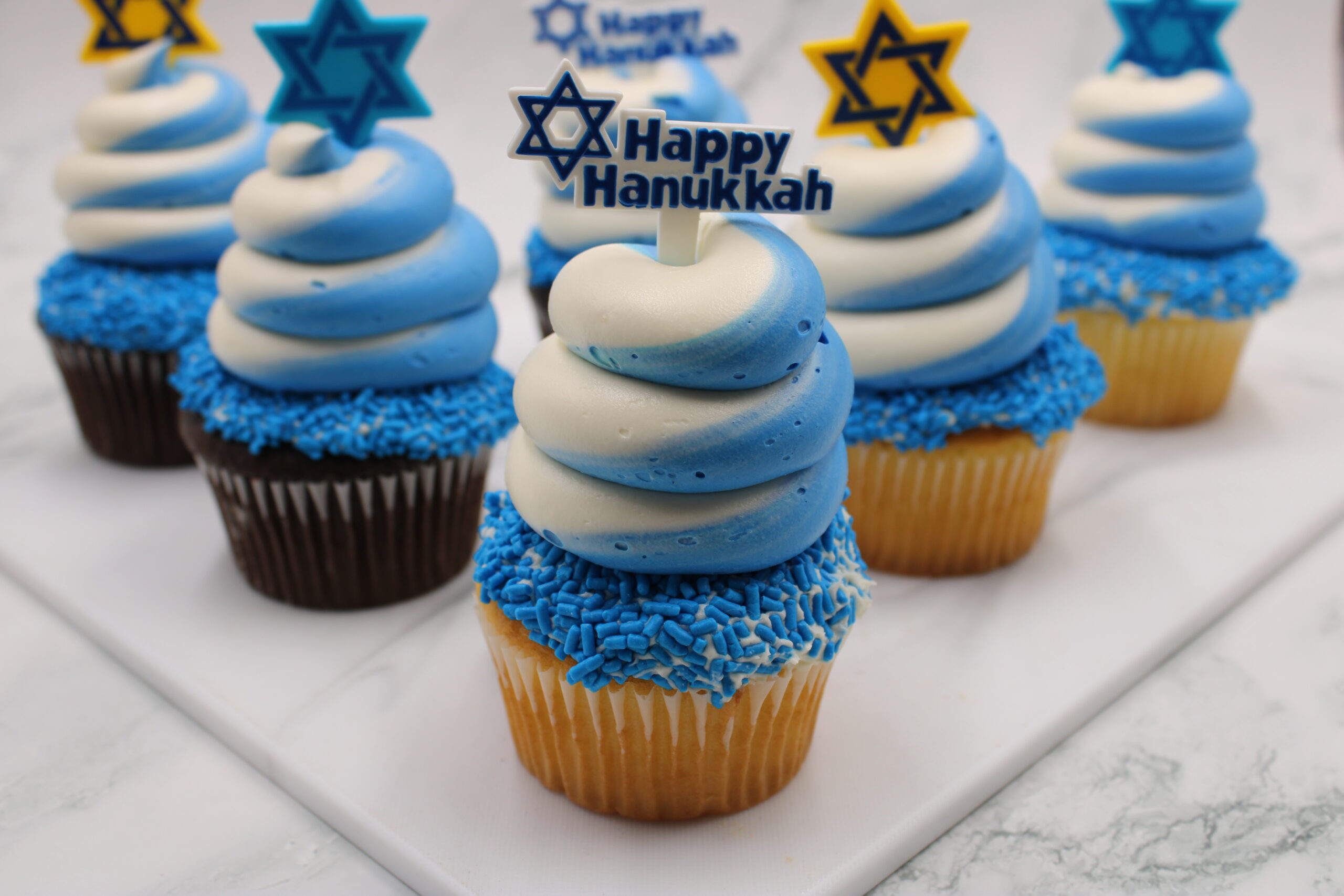 Celebrate Hanukkah with our fun blue and white deluxe cupcakes topped with a Star of David.