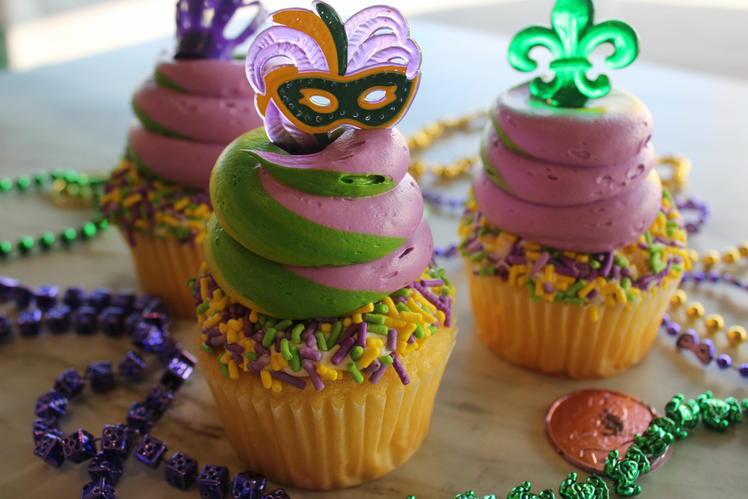 Fluffy, soft and buttery cupcake topped with our delicious buttercream decorated for Mardi Gras. (Please note that decorations may vary.)
